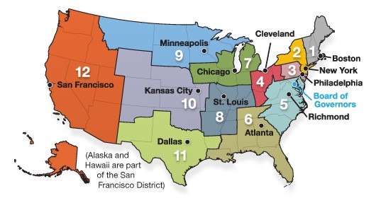 The Federal Reserve System consists of 12 independent banks that operate under the supervision of a federally appointed Board of Governors in Washington, D.C. Each of these banks works within a specific district, as shown.