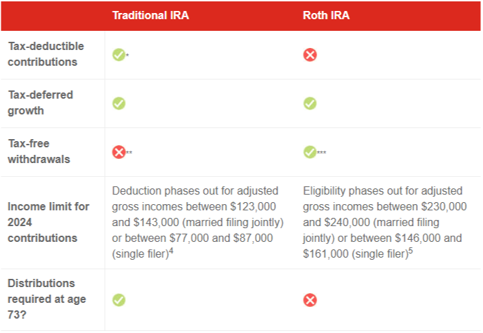 Like a traditional IRA, contributions to a Roth IRA are limited based on income. For 2024, contributions to a Roth IRA are phased out between $230,000 and $240,000 for married couples filing jointly and between $146,000 and $161,000 for single filers.4
